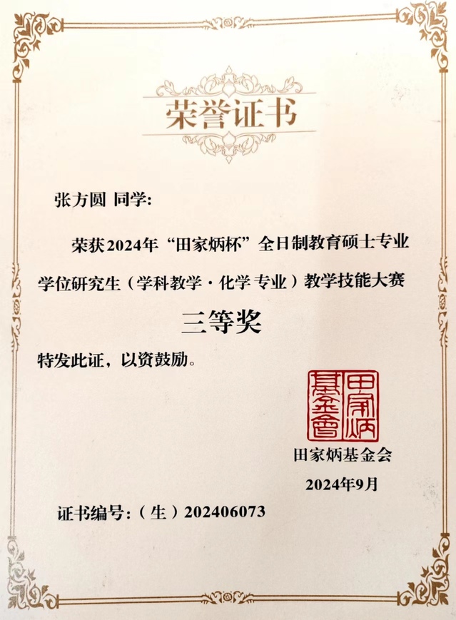 近日,化学与材料科学学院教育硕士张方圆同学在全国2024年“田家炳杯”全日制教育硕士专业学位研究生学科教学(化学)专业教学技能大赛决赛中荣获三等奖。