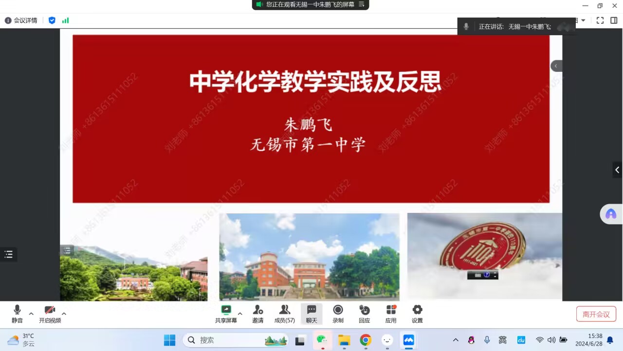 随后进入校外导师大讲堂环节。首先,由朱鹏飞教师带来主题为“中学化学教学实践及反思”的讲座,分为实践反思现状、典型案例分享和实践反思心得三个方面。朱老师提出要以公开课为抓手的教学实践反思,以自身对“苯”、“离子反应”的教学设计的思考和实践为例,引发对“为何写”和“写什么”的思考,指出要相信自己的研究和期刊的眼光,摒弃线性的写作方式,开展非线性写作,提出论文要多写多投稿,在写作过程中凝练思路和方法,要积极组建研究小组,善于分工合作等建议。接着,单世乾老师结合教学实践分享了教学经验。他以例题为例,指出培养学生关键能力的重要性,针对关键能力的内涵、培养路径和教学设计展开细致讲解。单老师指出要想做好教学设计,教师自身需要有深厚的知识功底,对学生思维障碍、迷失概念原因的准确把握以保证教学环节的科学性。