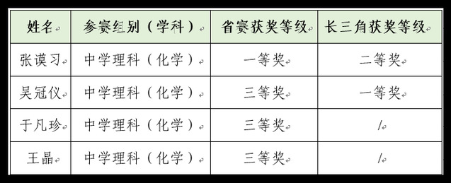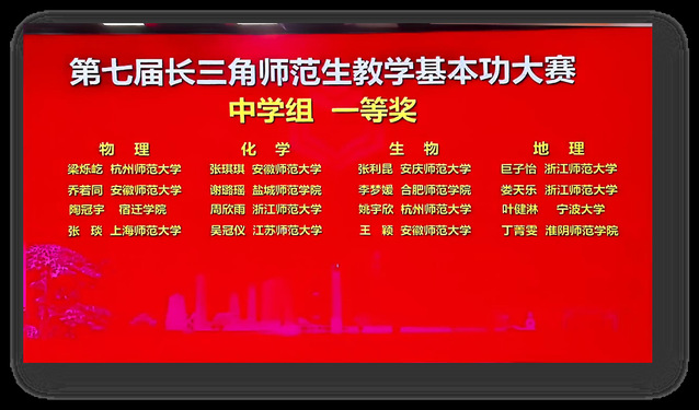 我院4名学子在中学化学组脱颖而出,斩获一等奖1项、三等奖3项,展现了扎实的专业功底与出色的教学能力。其中,吴冠仪、张谟习两位同学成功晋级第七届长三角师范院校师范生教学基本功大赛决赛,并分获一等奖和二等奖,再创佳绩。