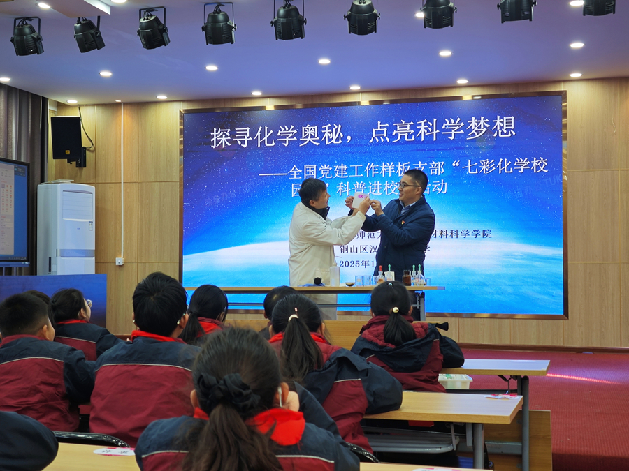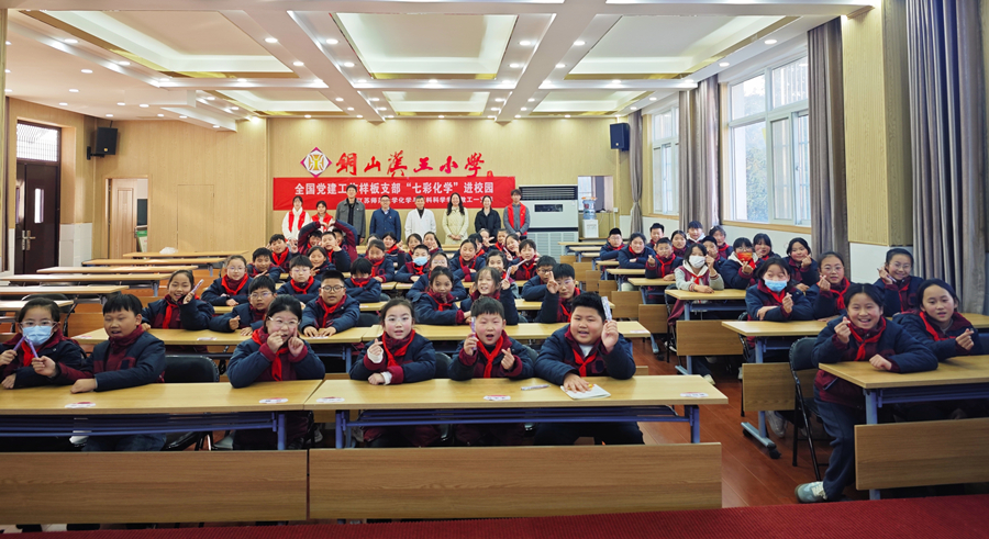 为激发青少年科学兴趣,提升科学素质,12月3日下午,化学与材料科学学院教工第一党支部赴铜山区汉王实验小学,开展“七彩化学校园行”科普进校园活动。学院党委书记吴晨、姜波教授、李团结教授和党员志愿者们为同学们带来了一堂沉浸式的化学科普课。