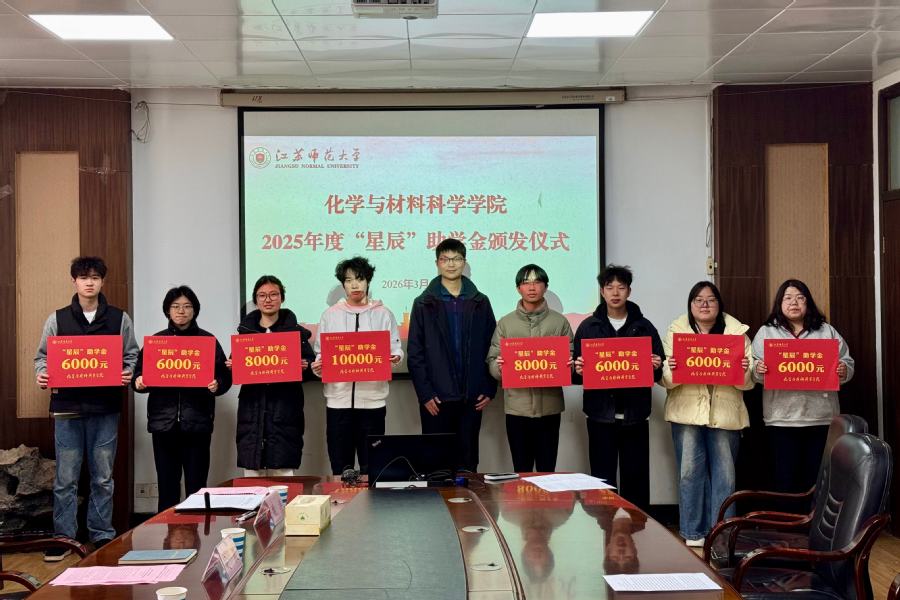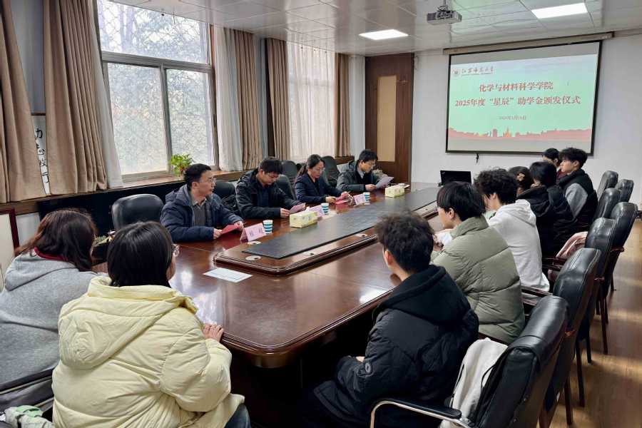 2026年3月16日下午,化学与材料科学学院举行2025年度“星辰”助学金颁发仪式。新沂市星辰新材料科技有限公司总经理唐明、学院党委书记吴晨、院长赖超以及8位获得资助学生出席仪式。仪式由学院资助辅导员魏涛主持。