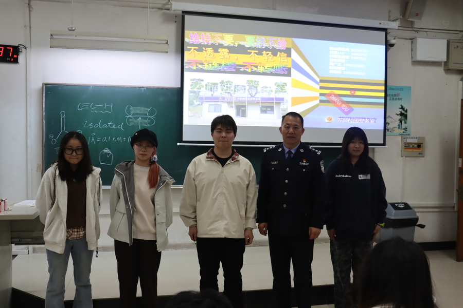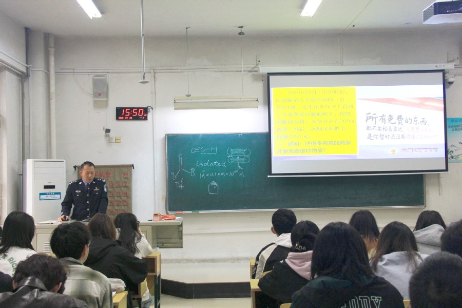 为切实守护学生财产安全,有效提升反诈防诈意识,遏制电信网络诈骗案件在校园发生,4月8日下午,化学与材料科学学院在7号楼107教室举办校园防诈反诈专题讲座。学院特邀驻校民警、四级高级警长周广文警官主讲。活动现场由辅导员魏涛老师主持。