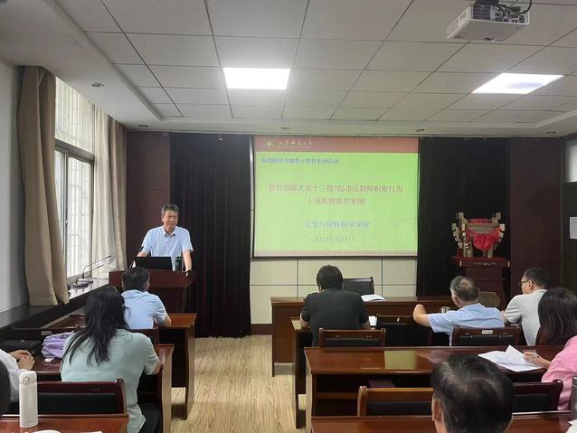 为进一步加强师德师风建设,提升教师的思想政治素质和职业道德水平,落实“师德建设第一标准”要求,根据《关于开展开学教育第一课暨师德师风专题教育活动的通知》通知精神,9月6日下午,化学与材料科学学院召开全体教职工大会进行2023年秋季开学教育第一课暨师德师风专题警示教育活动。党委王香善书记主持会议。