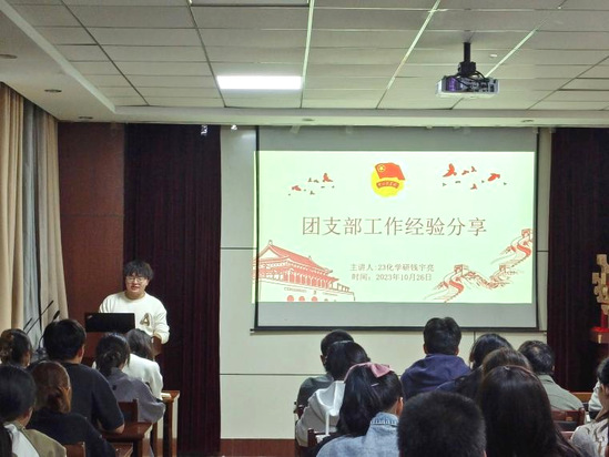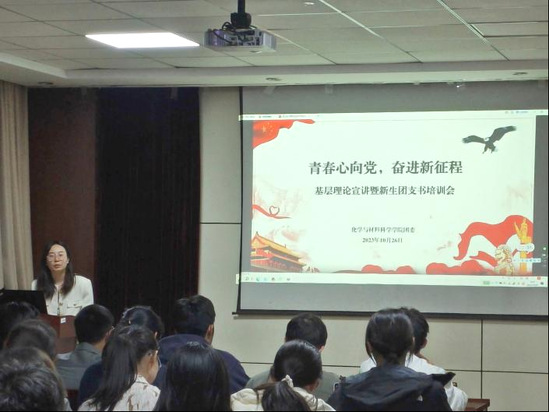 为深入学习宣传贯彻习近平总书记同团中央新一届领导班子成员集体谈话时的重要讲话精神,进一步提升学院班级团支书工作水平和能力,10月26日18:00,化学与材料科学学院在20#211会议室开展了“青春心向党 奋进新征程”理论宣讲活动暨班级团支书工作培训会。2023级化学研究生团支书钱宇亮同学担任主讲人,各班团支书、院学生会团建部成员参加了此次培训。会议由学院辅导员崔沁宇老师主持。