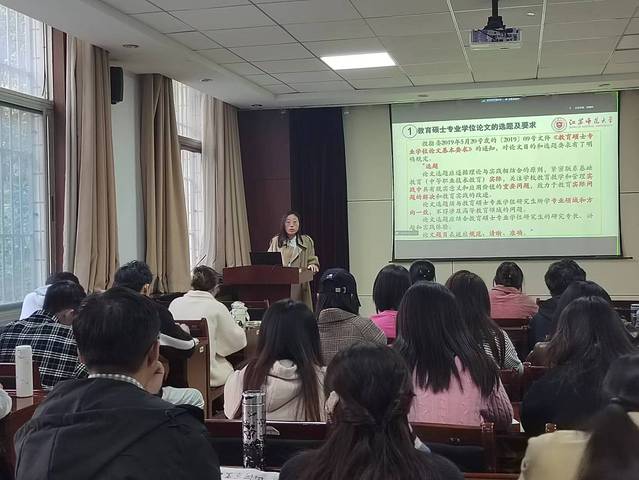 刘老师从解读《教育硕士专业学位论文基本要求的通知》入手,从概述、选题、文献综述、研究方法、格式要求和不同形式论文基本要求等六个方面详细讲解了教育硕士学位论文的撰写要求。强调教育硕士论文选题应首先突出教学实践性,要立足教育教学实践研究领域、紧扣研究课题、突出研究问题,表述要规范、清晰、准确。此外,刘老师还讲解了双盲评审及学位论文抽检的相关注意事项。