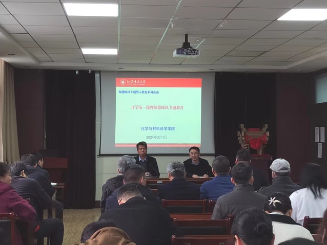 为进一步加强师德师风建设,提升学院教师的思想政治素质和职业道德水平,根据《关于开展师德师风专题教育活动的通知》(教工部发〔2024〕1 号)要求和学院工作安排,3月1日下午,化学与材料科学学院在211会议室开展2024年春季学期开学第一课暨师德师风专题教育,学院党委王香善书记主持活动。
